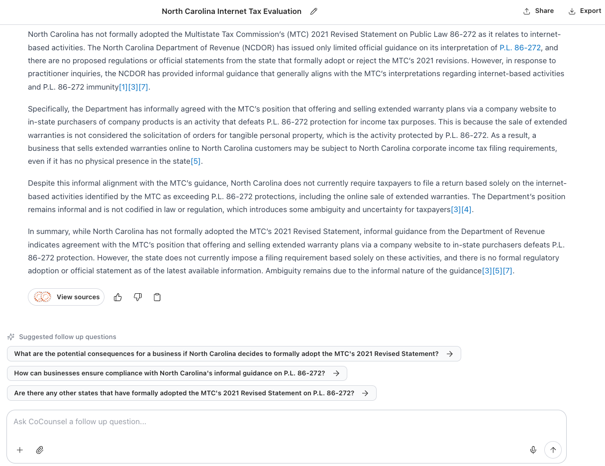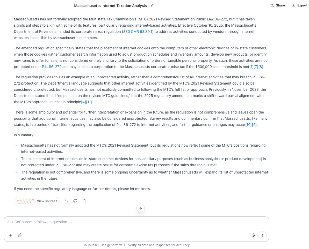 Our 86-272 Template incorporates this level of detail. We’ve mapped every internet activity the MTC targeted and built detailed state-by-state analysis into the prompt. California, New Jersey, New York, and Massachusetts have moved to adopt the MTC’s position through regulations or guidance. Many states remain silent, until they raise the MTC stance on audit.
