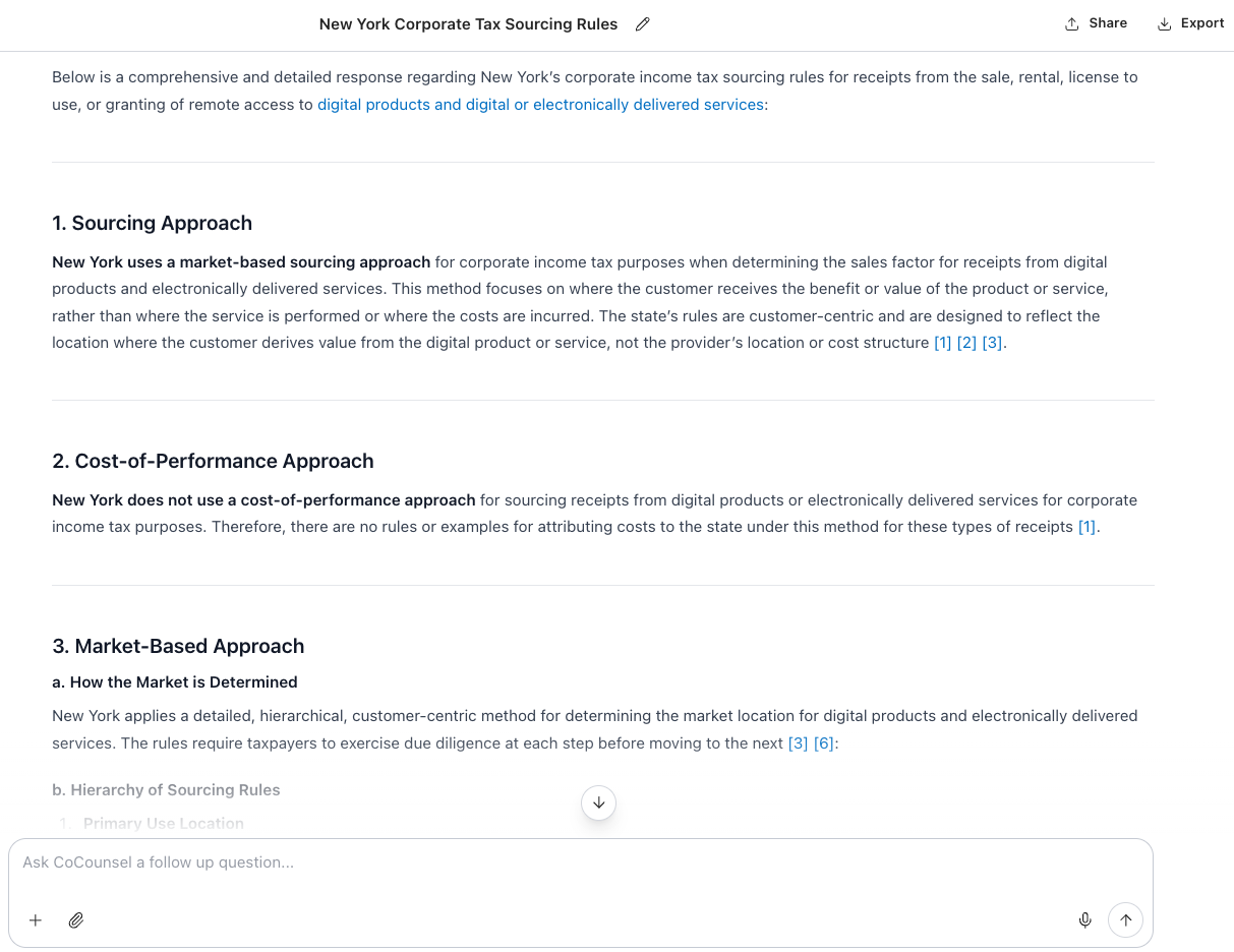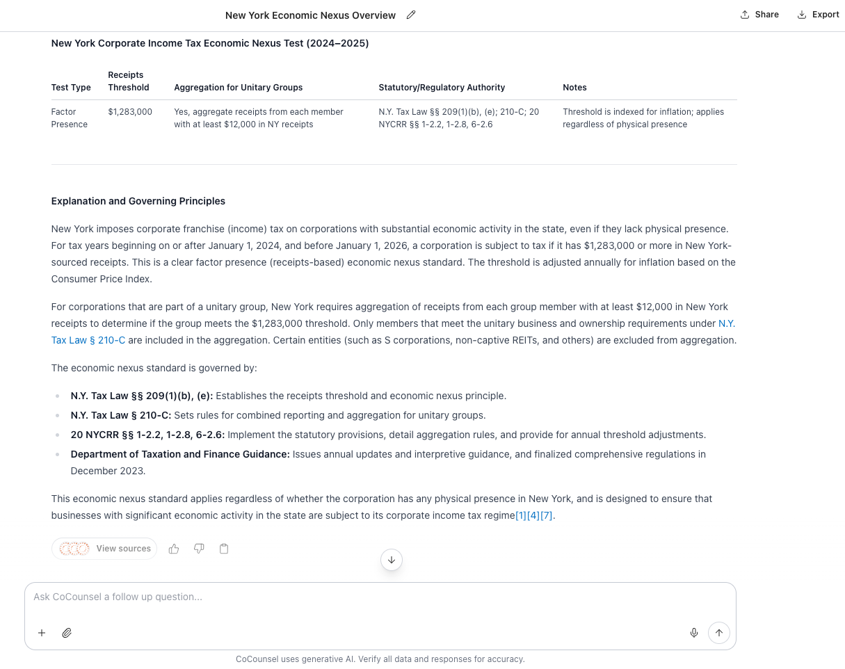 - CoCounsel Tax provides expert-built AI templates for complex corporate income tax nexus questions.