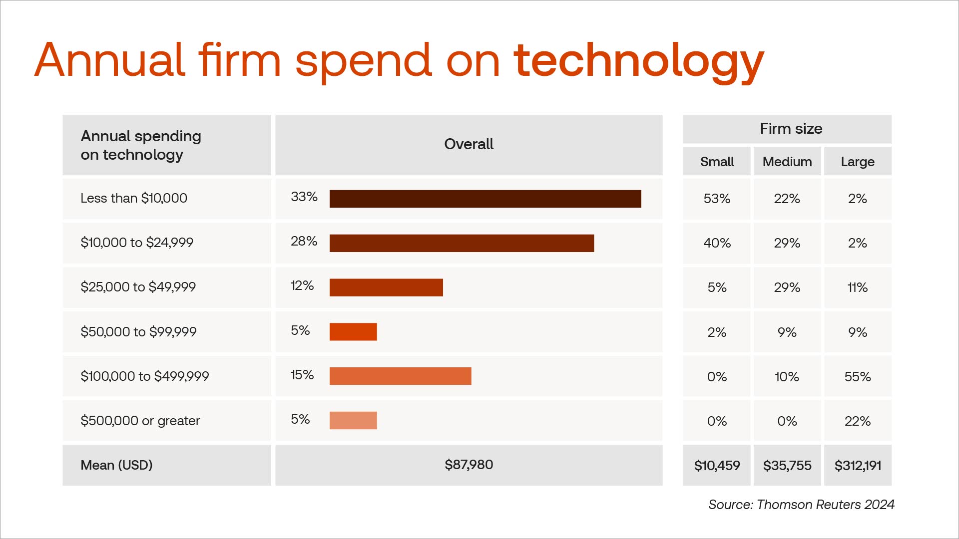 Based on survey findings from the Thomson Reuters 2024 Tax Firm Technology Report, accounting firm budgets for large practices allocate an average of 30 times what small firms spend on technology. Even mid-sized firms had less than 1/9 the technology budget of their large counterparts even though the average differential in staffing size was much closer.