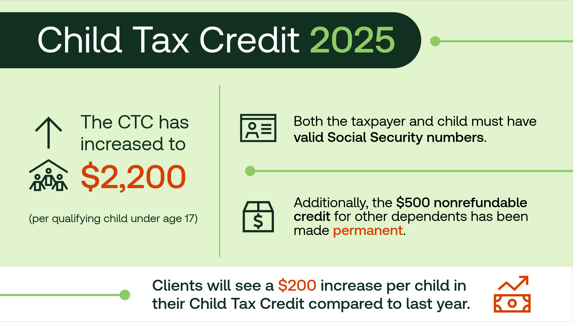 On 2025 returns, the Child Tax Credit has increased to $2,200 per qualifying child under age 17, up from $2,000 in prior years. This enhancement is now indexed for inflation going forward.