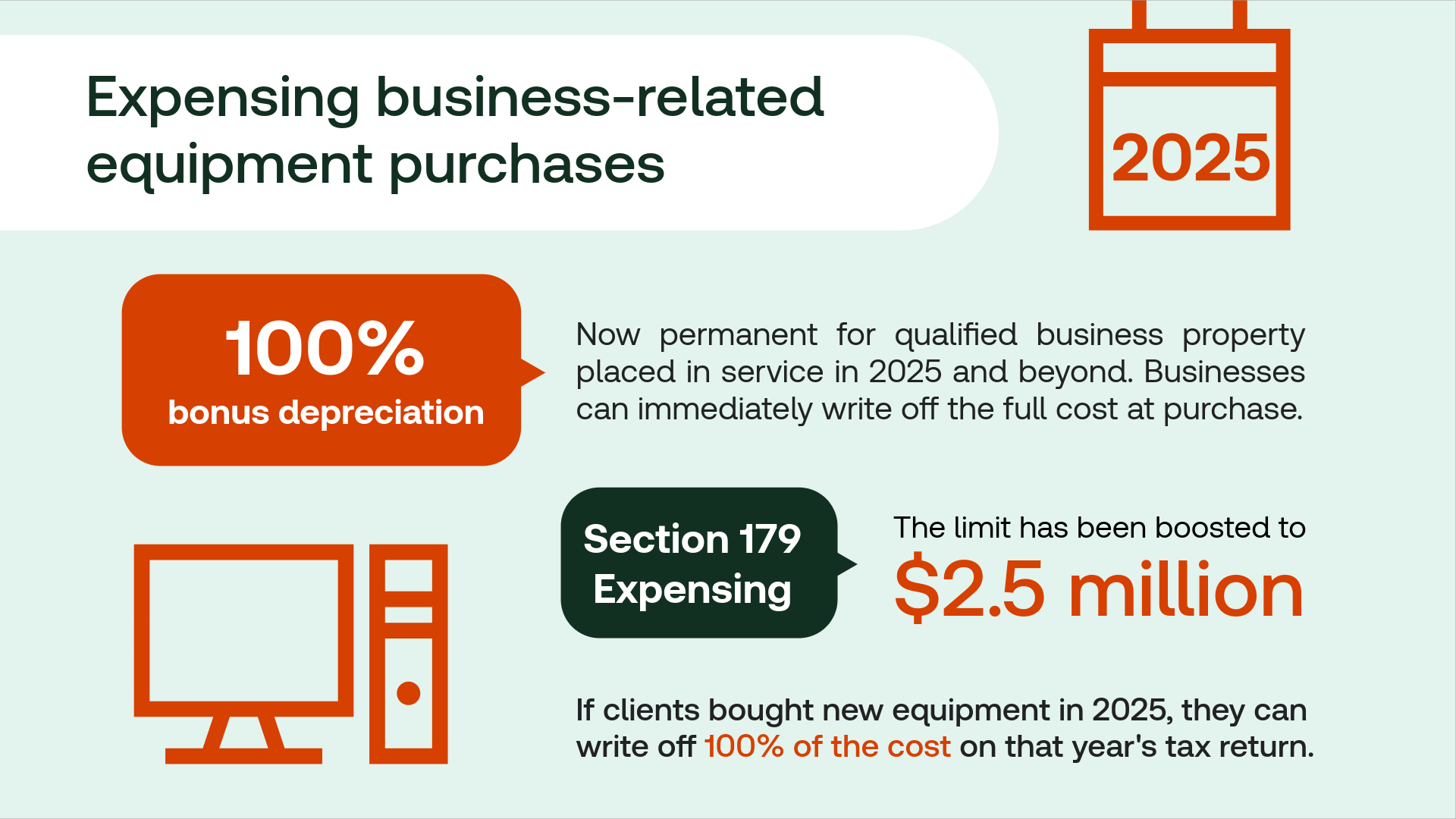 If clients bought new equipment or other depreciable business property in 2025, they can write off 100% of the cost on their 2025 tax return.