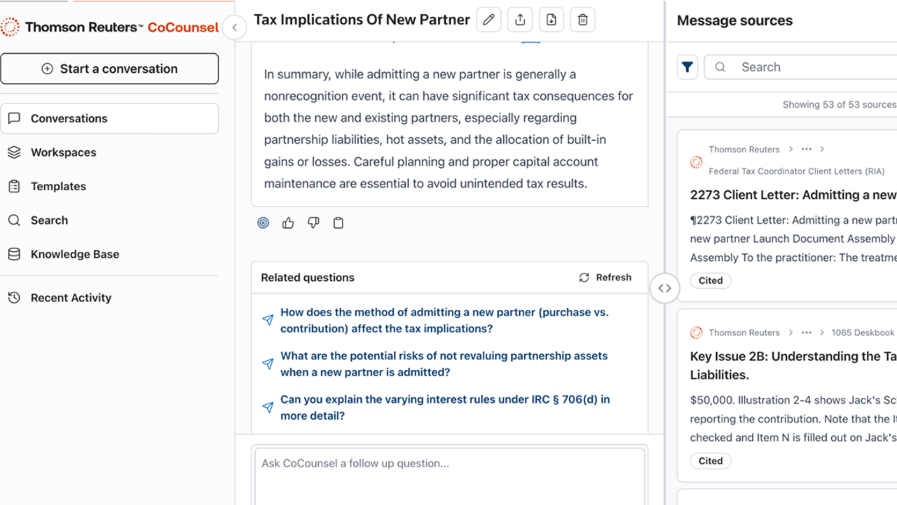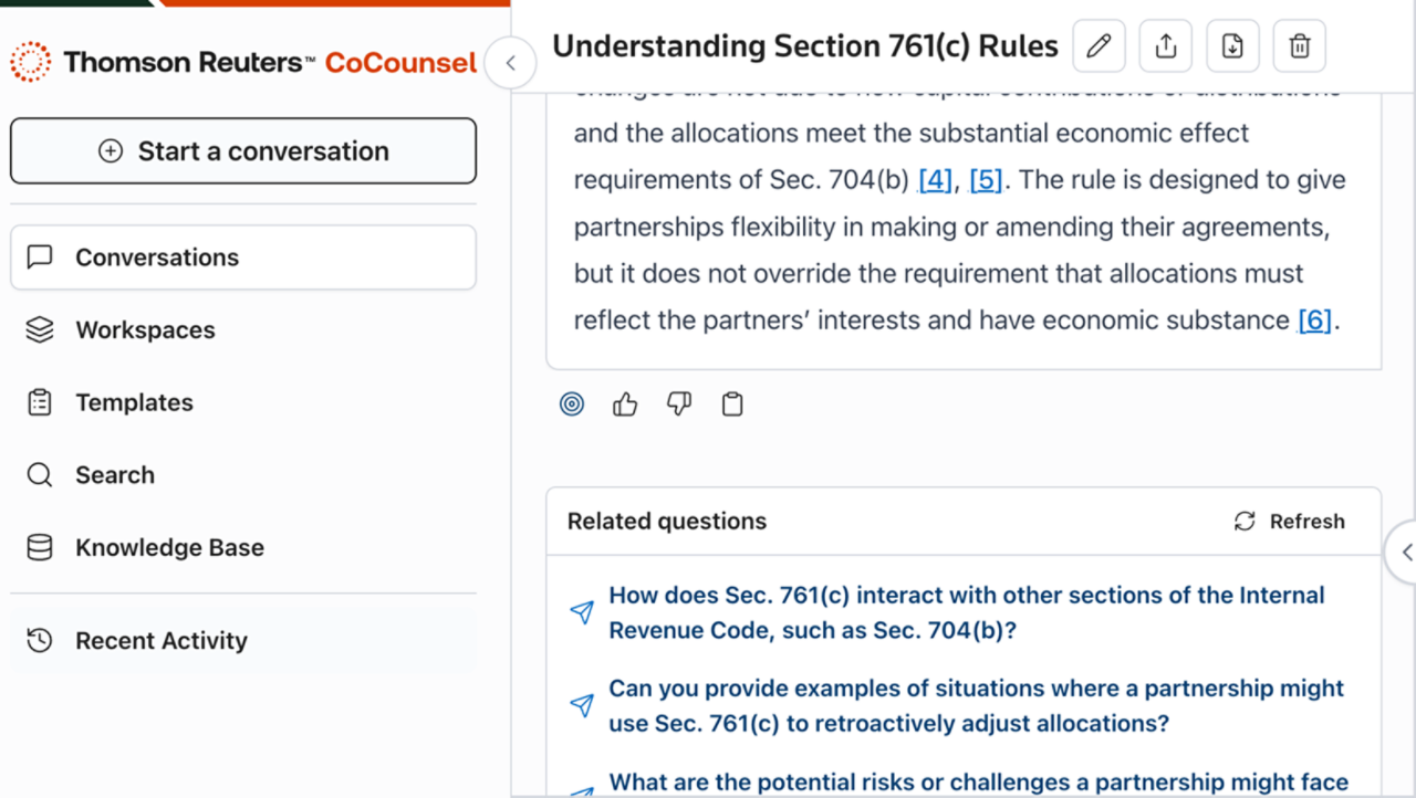 Submit your tax research questions conversationally and receive clear, plain-language answers backed by citations from the IRS, case law, regulations, and Checkpoint's trusted content. Every answer includes embedded sources so you can verify with confidence.