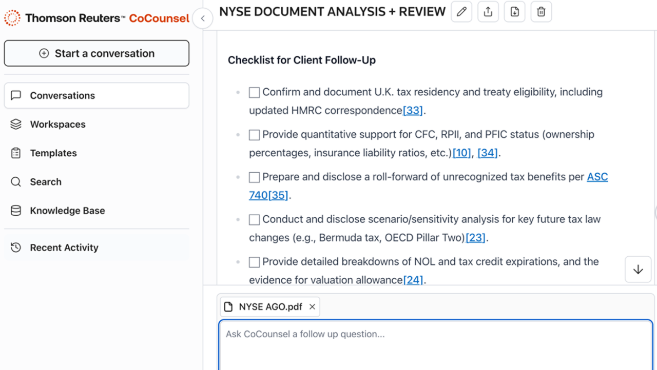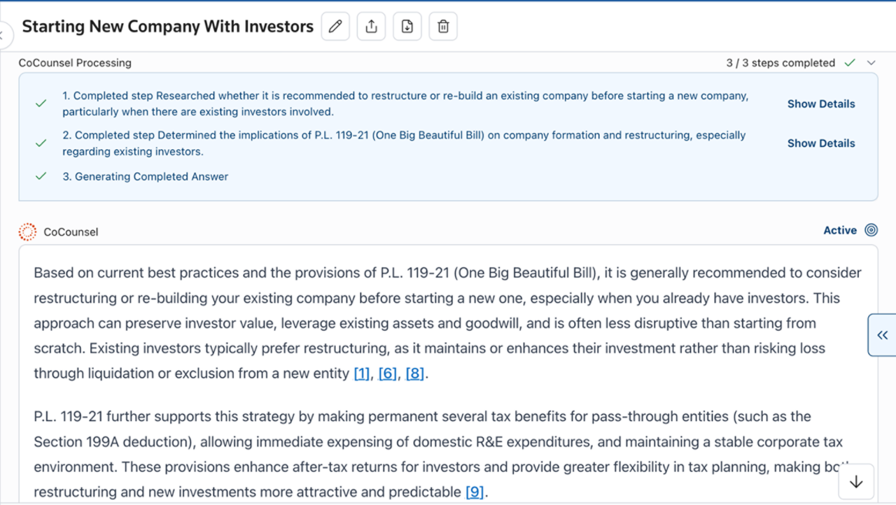CoCounsel Tax combines AI technology with trusted Checkpoint content to deliver precise, cited answers to your most complex tax research questions