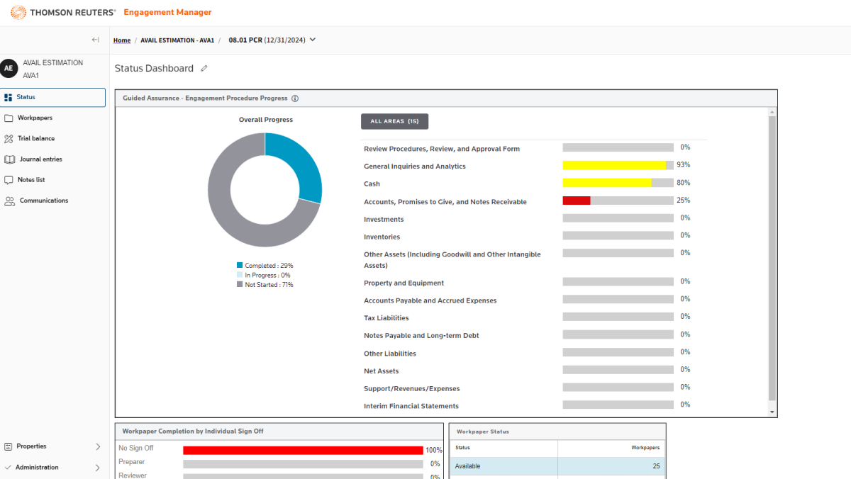 Monitor your team's progress and move seamlessly between engagements. The status dashboard offers managers an overview of different audit areas, making it easy to oversee multiple engagements simultaneously.