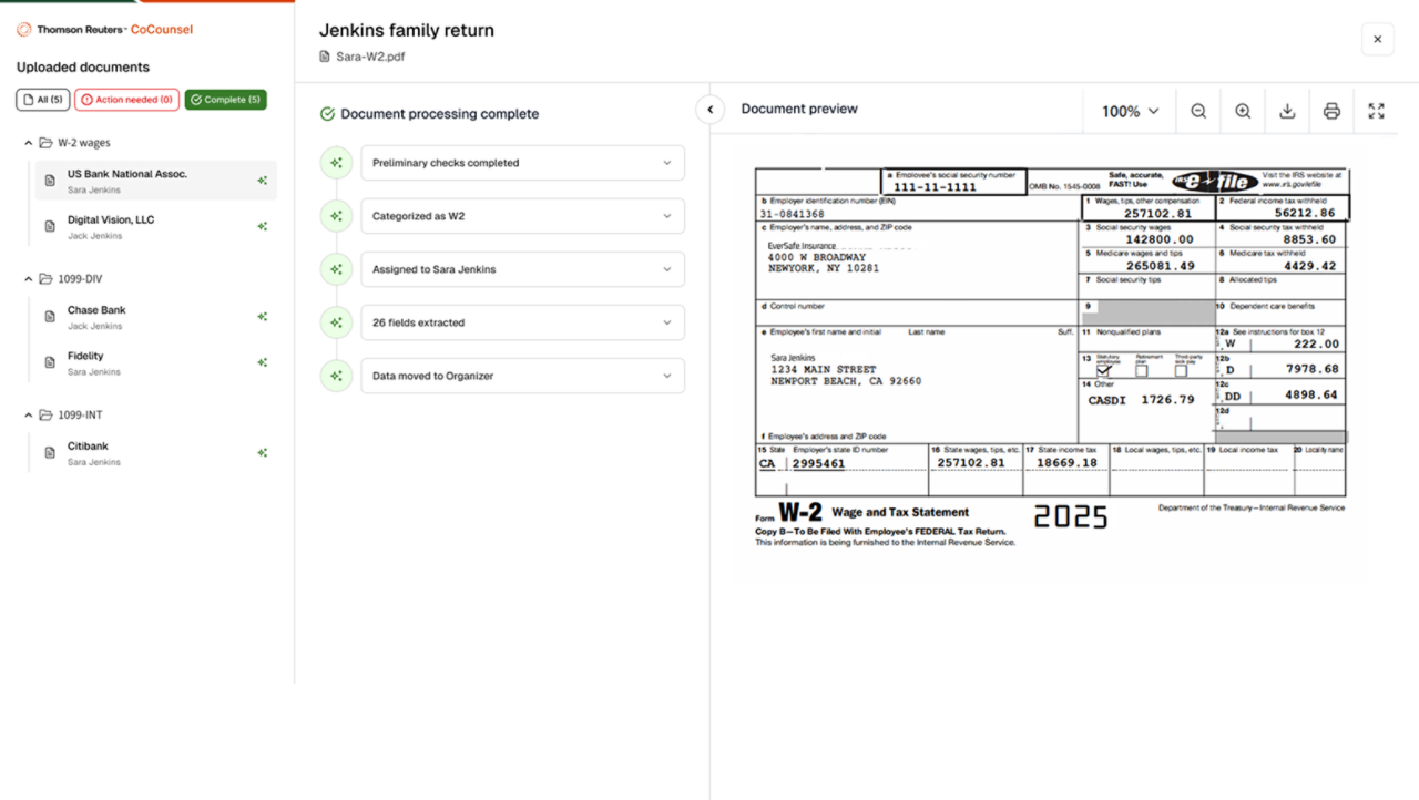 Implementation is straightforward: provision access in CoCounsel Tax, define your document intake process, and begin uploading client documents and prior returns.