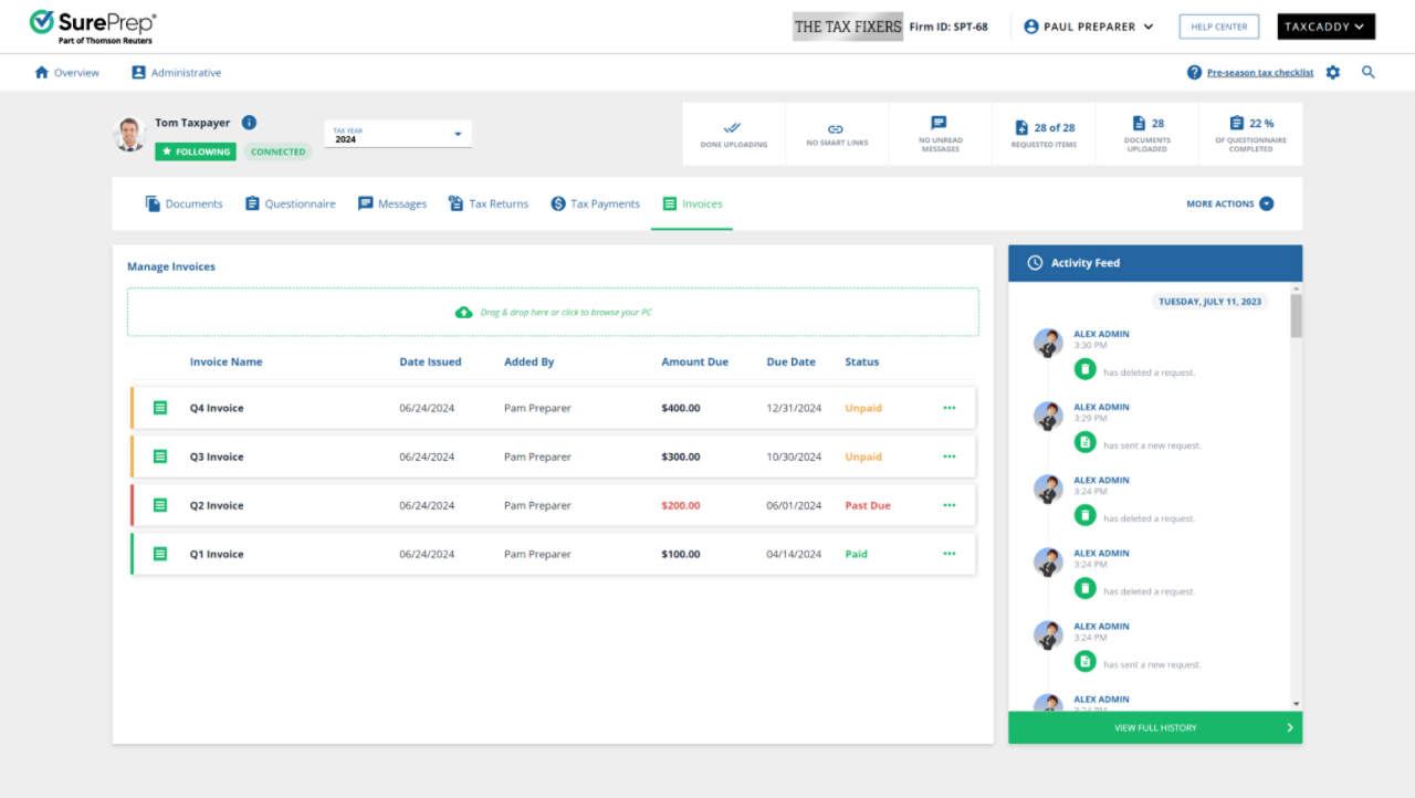 Easily manage invoices under Client Profile in TaxCaddy with effortless PDF uploads, automatically updated payment statuses, and the facilitation of payments via Stripe. You can also handle delivery within the Client Profile by simply dragging and dropping the final return to a specific tab. Clients will own their accounts to retain access to all their prior returns indefinitely.