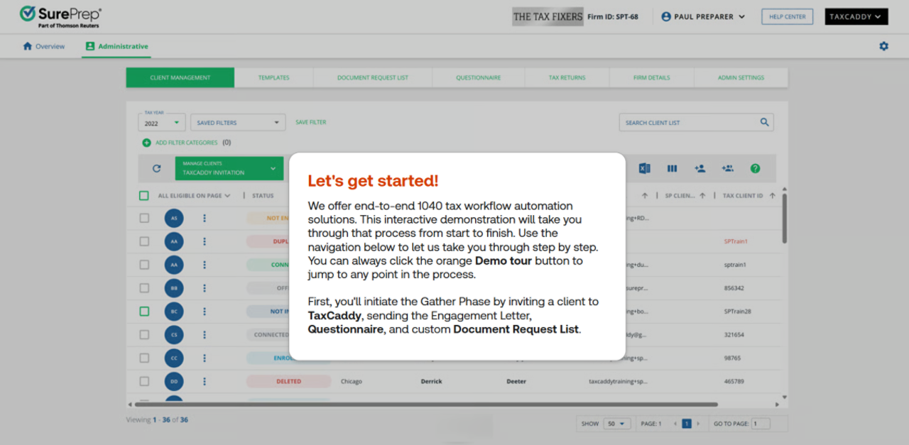 GoSystem Tax RS seamlessly integrates with SurePrep to boost efficiency throughout every step of the 1040 tax process. This interactive demonstration will take you through the process from start to finish. Use the in-demo navigation to take you through step by step.