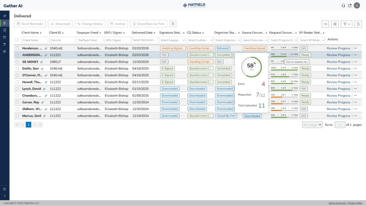 By automating repetitive tasks like data entry, document organization, and client follow-ups, our technology recovers hundreds of hours per year. This allows your staff to focus on high-value review and advisory work, reducing burnout and overtime.